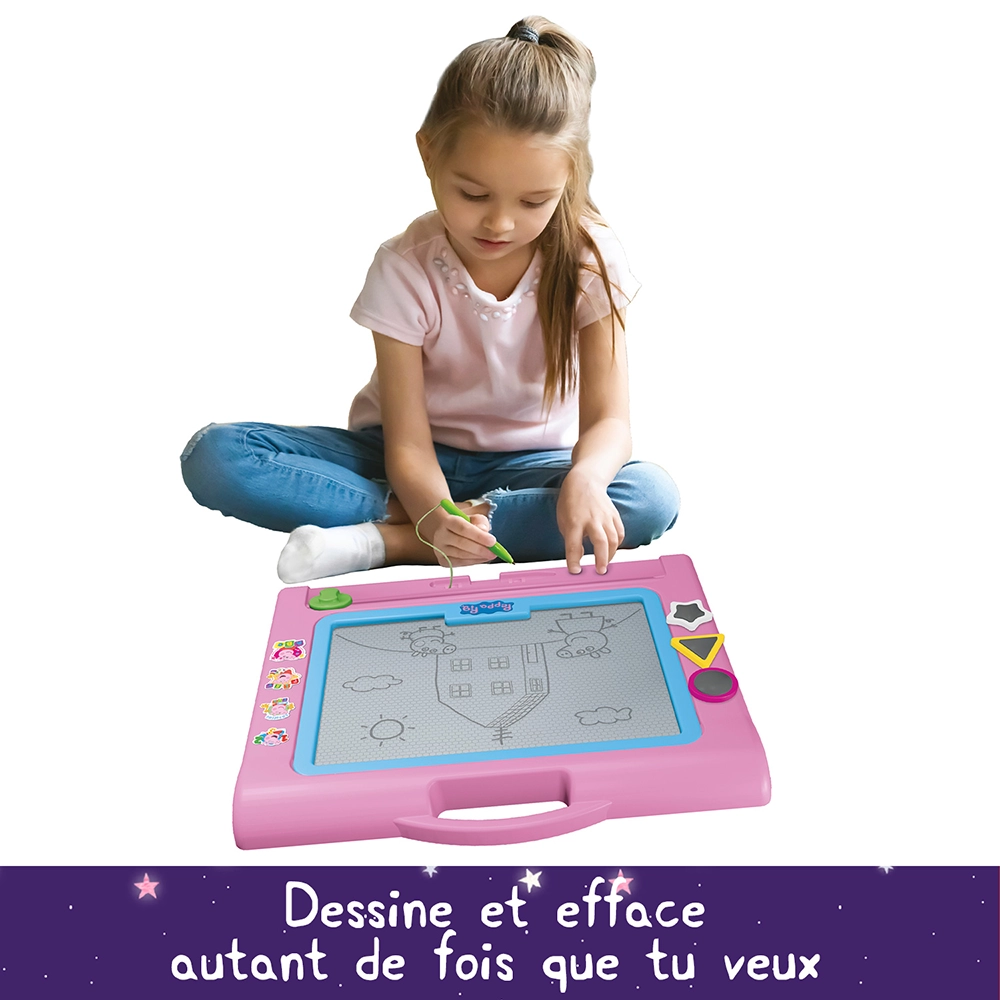 ARDOISE PEPPA PIG AVEC STYLO – Avec l’ardoise magique Peppa Pig, les enfants peuvent créer à volonté, effacer et recommencer encore et encore. Le stylo dessine facilement sans tacher les mains ni les vêtements.